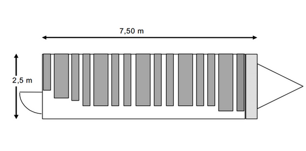 7.5 x 2.5m for up to 36 persons: rear entrance, gas heating, lighting, tables and benches for up to 36 persons.